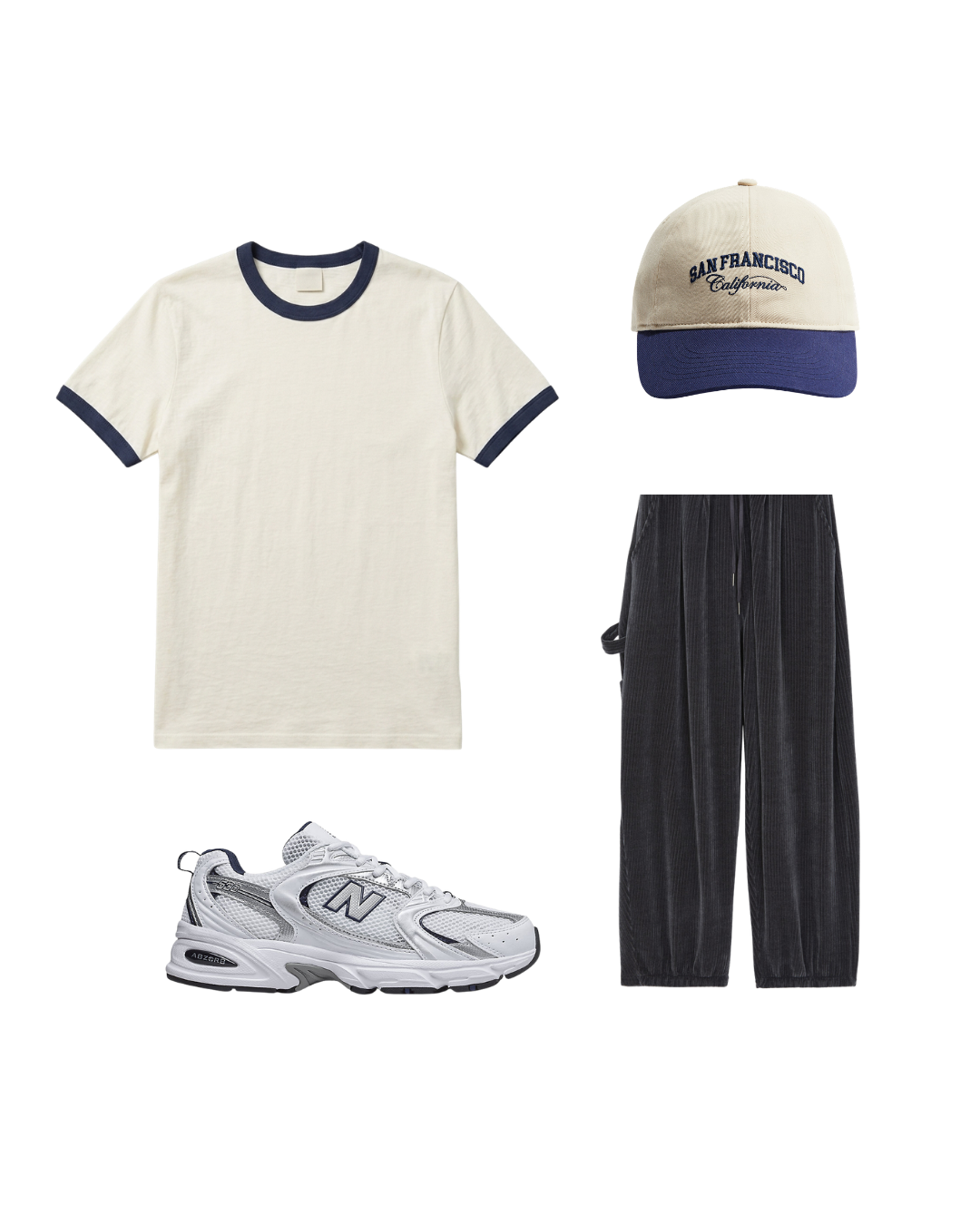 A build structured around restraint. The cap anchors the silhouette at the top, the rib tee sits close to the body, and the corduroy trouser adds texture and weight below. The New Balance 530 closes it — chunky enough to ground the look, neutral enough not to compete.