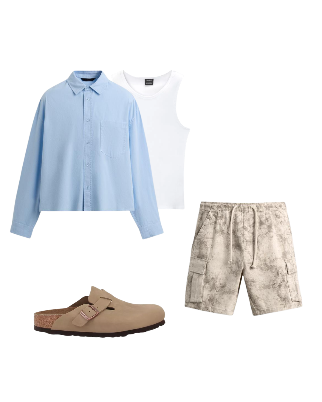 Relaxed layering built on tonal cohesion. An oversized shirt open over a ribbed tank anchors the upper volume, while wide-leg cargo shorts and suede clogs close the proportion below.